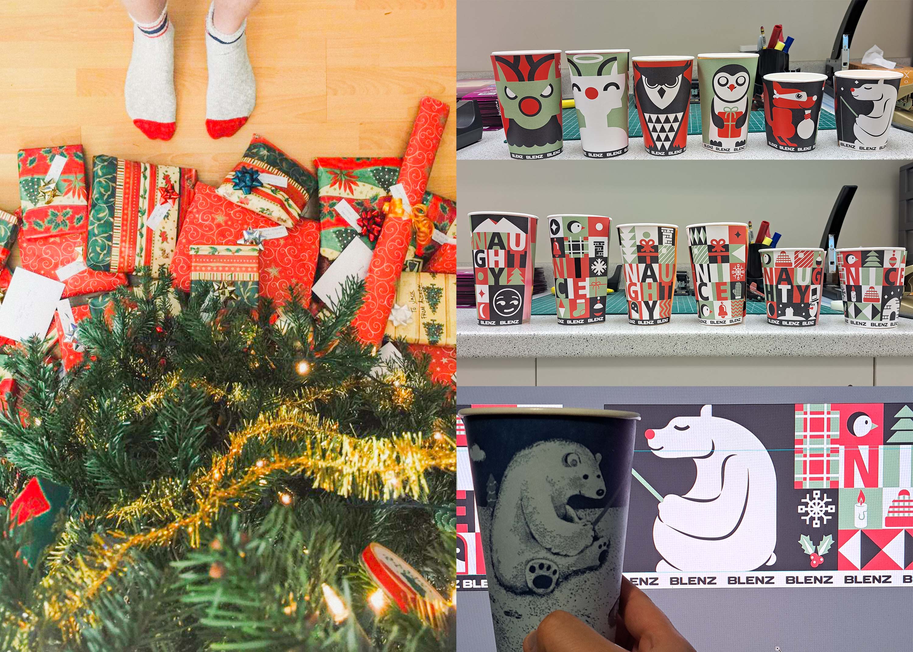 Inspiration and early concepts for the cup design. For creative consistency, we also brought back the winter-themed animals from last year (deer, moose, owl, polar bear, and penguins) to emphasize the whimsy and joyous holiday spirit.